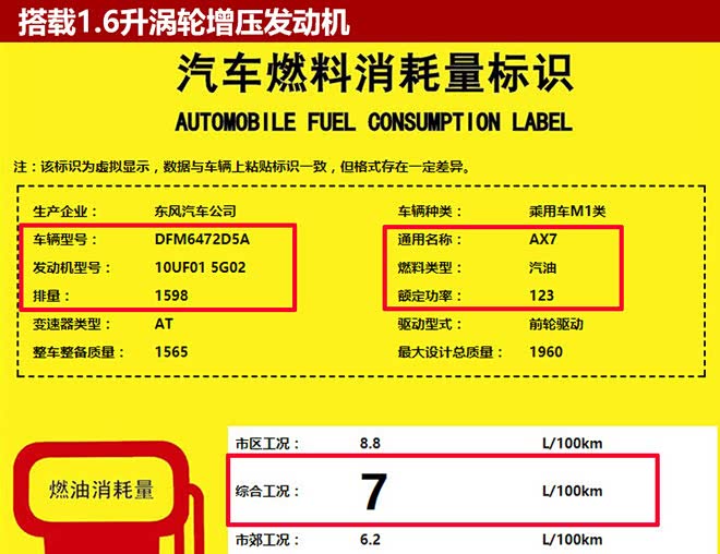 从国家工信部公布的信息可知,东风风神AX7将新增一台型号为10UF01 5G02的1.6升涡轮增压发动机,额定功率123千瓦,百公里综合油耗7升。
