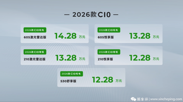 5月15日,2026款 零跑C10(参数|询价)正式上市,新车售价为12.28-14.28万元,全系共推出5款配置车型,继续提供纯电及增程两种动力类型。新款车型增加了全新车身颜色,并在车内配置、动力系统及智能驾驶辅助等方面均有所升级,同时高配车型还配备了激光雷达。
