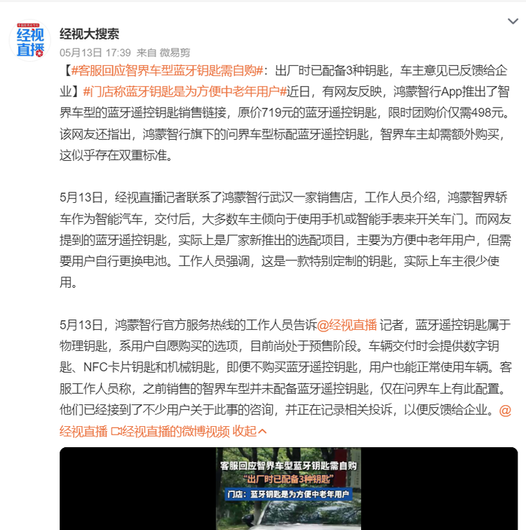 一把钥匙引发用户“双标”质疑?鸿蒙智行官方客服回应