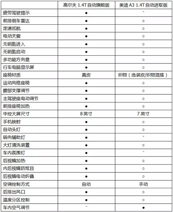 它俩不同之处在于大众高尔夫在配置上多了太多(具体见下表),虽然这些配置奥迪A3也大部分提供选装,但在性价比方面的差距已经非常明显了。并且通过这些配置差异来看,在动力和价格相近的前提下,同样在设计做工上继承了德系精致细腻的高尔夫反而成为了真正能够享受驾驶和出行的产品。奥迪A3则除了品牌之外,低配车上许多配置的缺失不仅仅是不能体现什么豪华了,更是觉得非常尴尬。