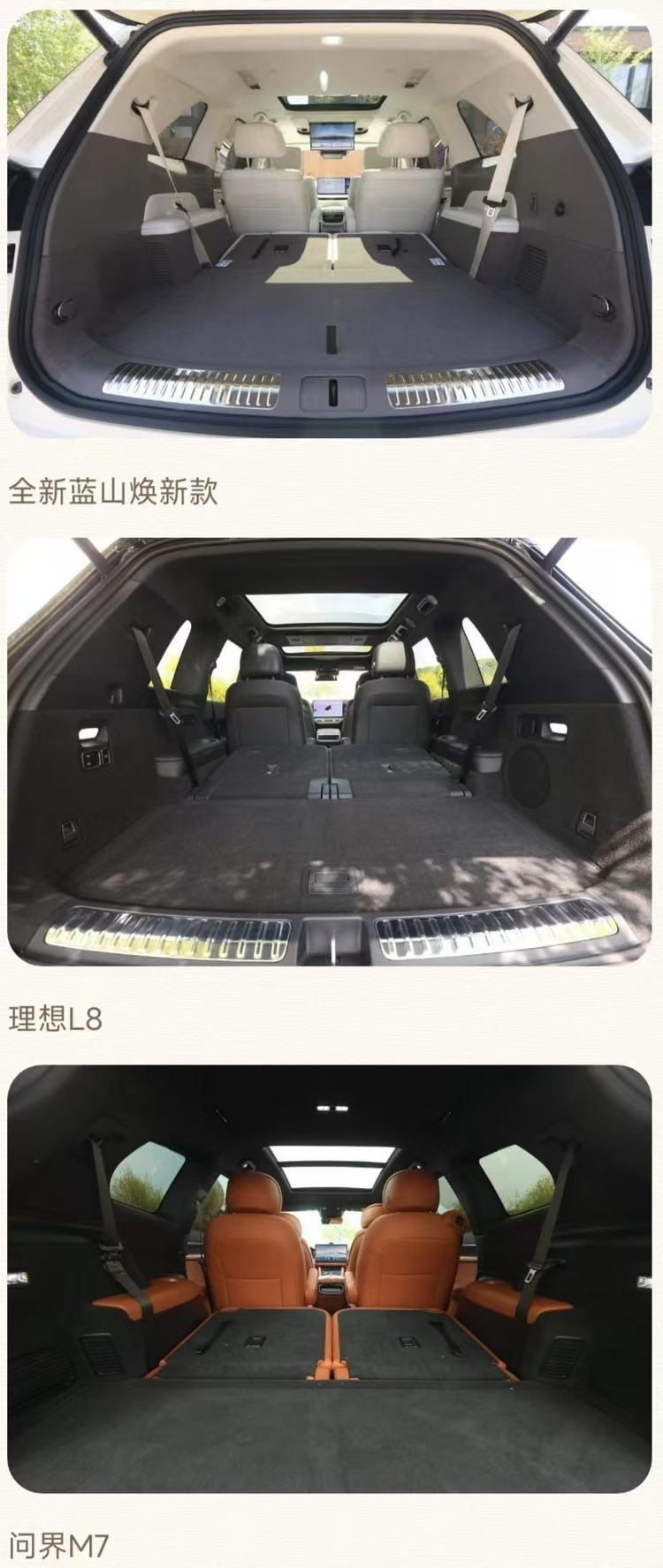 在空间表现上,魏牌全新蓝山焕新款以3050mm轴距占据绝对优势,其第三排腿部空间达到826mm,头部空间851mm,无论是儿童或成年人都能长时间保持舒适。同时,后备箱基础容积为349L,折叠第三排座椅后可扩展至1040L,装载能力全面胜出,可轻松应对家庭远途旅行需求。理想L8的轴距为3005mm,第二排腿部空间达到1021mm,是三款车型中最宽敞的一排,为中间乘客提供了良好的乘坐体验。然而,其第三排腿部空间仅722mm,长途使用可能会稍显局促。此外,后备箱容积为313L,日常使用足够,但储物能力不及全新蓝山焕新款灵活。问界M7的轴距最短,仅2820mm,尽管座椅靠背角度调节设计提升了一定舒适性,但其后备箱容积仅188L,满员状态下很难满足家庭的储物需求。