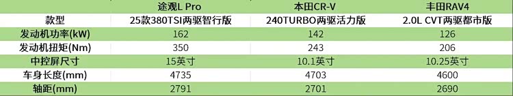 在硬件配置方面,途观L Pro也实现了越级领先的表现。这一级别中罕见的双联屏设计包括一个15英寸的中央控制屏幕和一个11.6英寸的副驾驶娱乐屏幕,为驾驶员和乘客提供了更为丰富的视觉享受。CR-V配备了10.1英寸的中控显示屏,而RAV4则有10.25英寸的中控屏。这两款屏幕的尺寸都相对较小,并且都没有配备副驾娱乐屏,这使得它们在科技和豪华方面与途观L Pro相去甚远。