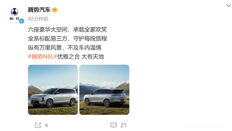 腾势汽车也在社交媒体上官方宣布,腾势N8L全系标配腾势易三方技术,也就是全系都将搭载三电机。