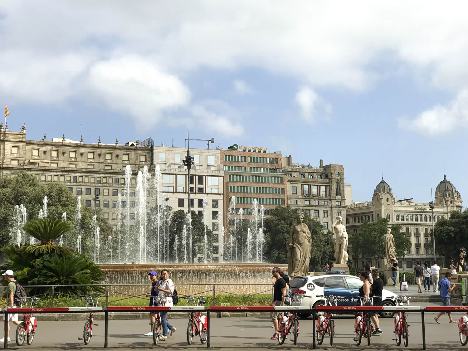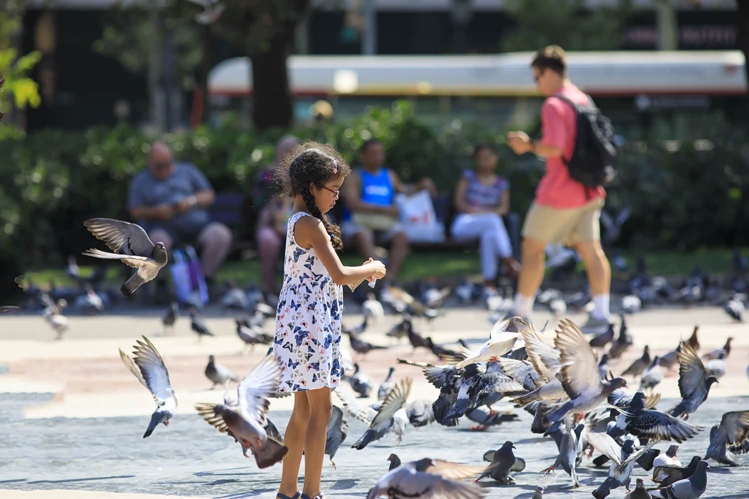 起点的加泰罗尼亚广场是兰布拉大道的起点,这里四周都是百货公司,旅游大巴的中转站也位于此处,这里有两样很名,一是鸽子二是小偷。鸽子很多很多,而且很霸道,飞的时候得人让他们。