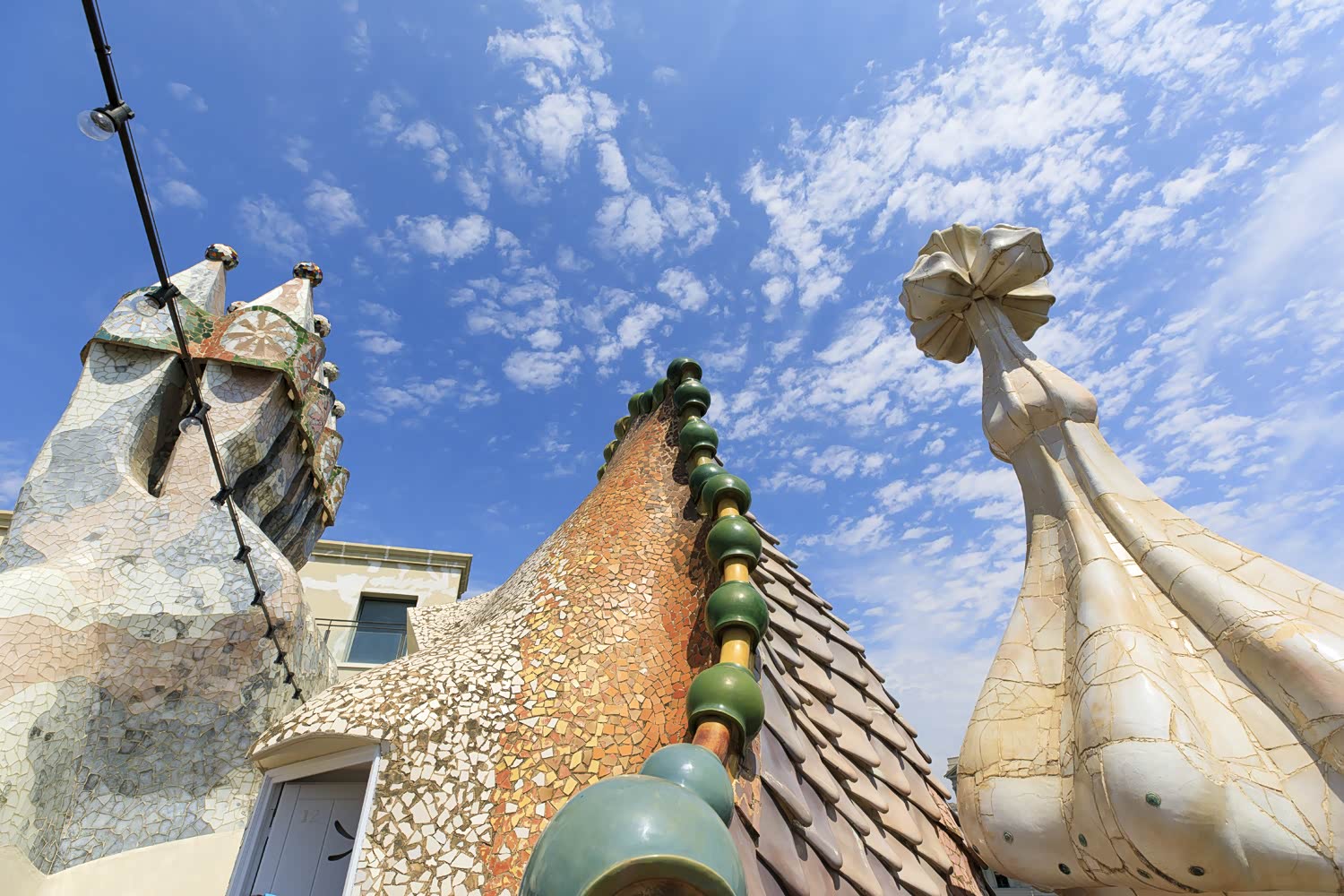 屋顶也巴特罗之家最精彩的一部分,左侧为烟囱,被巧妙的设计成了蘑菇状,让人想起草原里生长的一簇簇野蘑菇。中间的屋顶被设计成巨龙的脊背,披着鳞片。