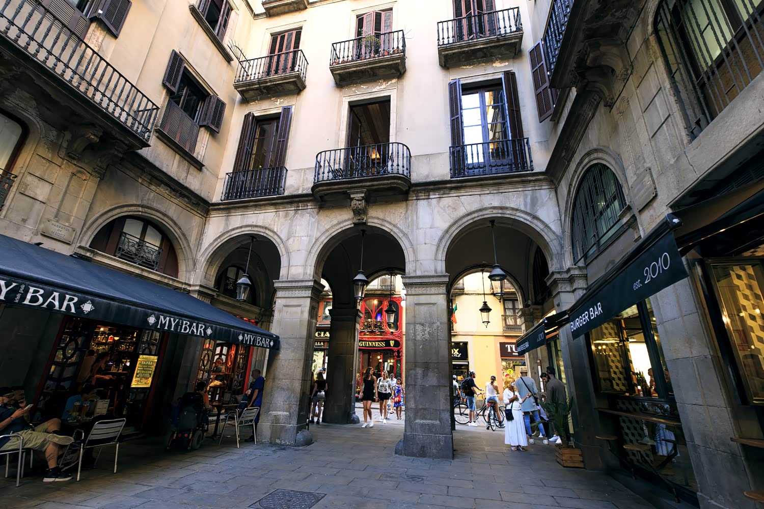 教堂的西侧便是著名的莱埃那塔大街,两侧的老建筑也非常完整,一路往北,便可以通往加泰罗尼亚广场,当然,你也可以顺利迷宫似的小巷一路往西南方向,便可以重回到兰布拉大道。这里面藏着许多有悠久历史的饭店与咖啡馆