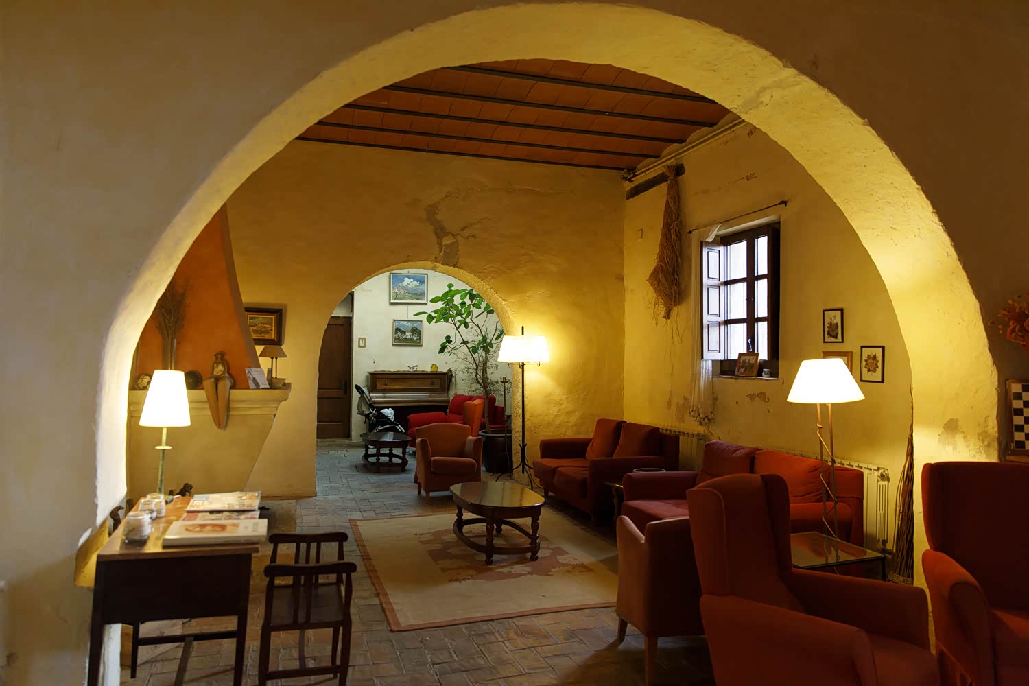 客厅的壁炉,很像魔戒里的中土世界,火炉两旁的长椅设计据说是为当时贵族小姐上门做客时设计的,当时富人家的小姐外出,必须要有一个仆人随同,所以就设计了两个长椅,他们交流时仆人就坐在对面,脑补一下这个画面,这灯炮也太亮了。