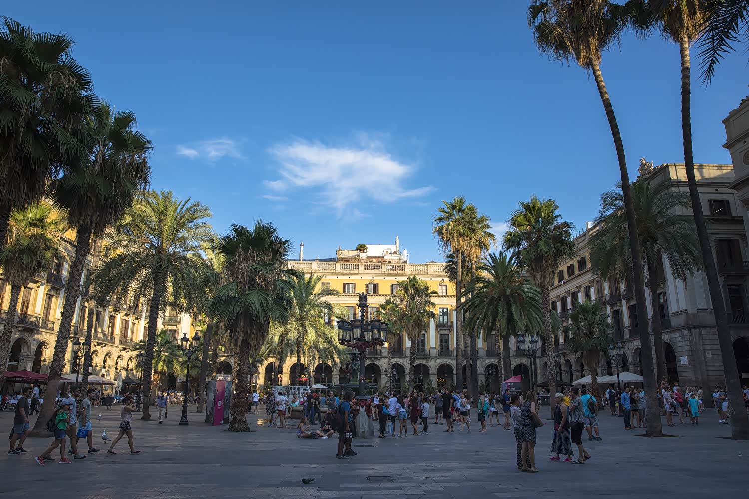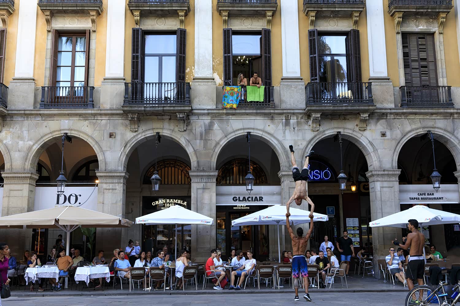 皇家广场位于兰布拉大道的东侧,难得在一大片密密麻麻的老建筑中有那么一个空隙,广场两侧也全是各种餐厅,楼上便是酒店,一些街头艺人会在这里表演挣点小费