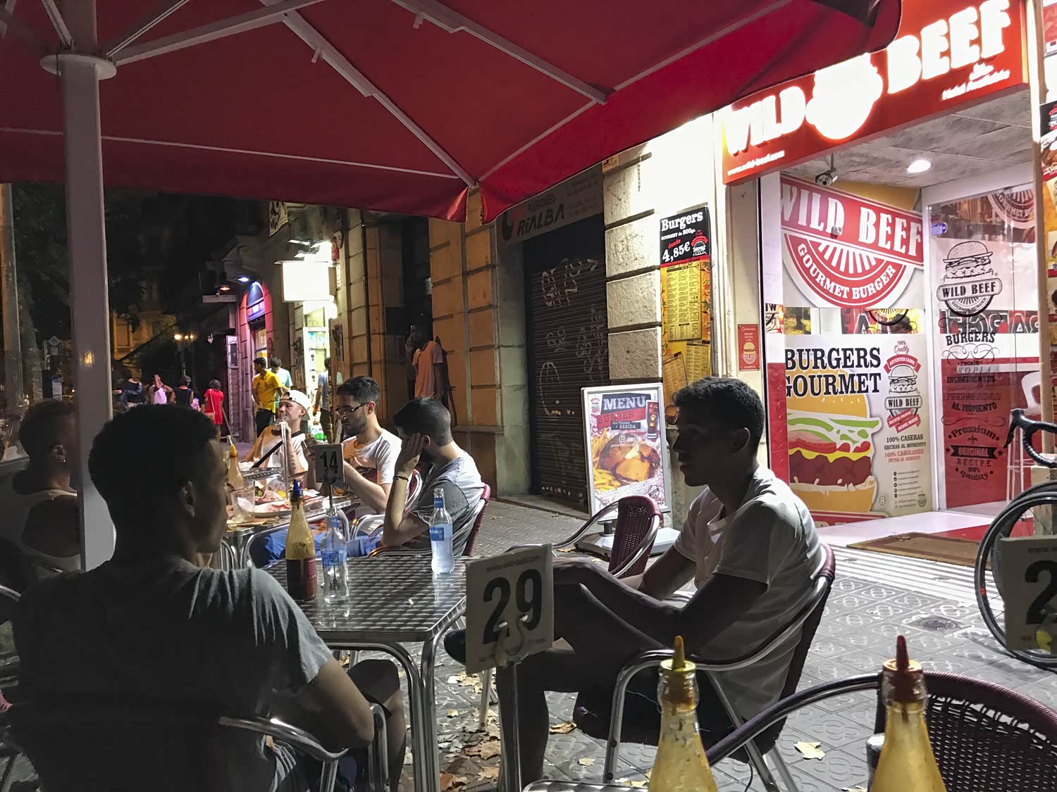 停完车,办完入住,已是晚上十一点,终于轮到搞定自己的饥肠辘辘的肚子,即便是晚上十一点,巴赛罗那的街头仍然热闹非凡,随便选了一家酒店对面的汉堡店,对于饿了大半天的我们来说,快速量大的汉堡是第一选择,别看门面一般,他们后来端上来汉堡虽然外相一般,但份量和口感着实让我们惊艳了一下,牛肉鲜嫩,个头绝是我这辈子吃过的最大的汉堡,巴赛罗那人都那么能吃吗?