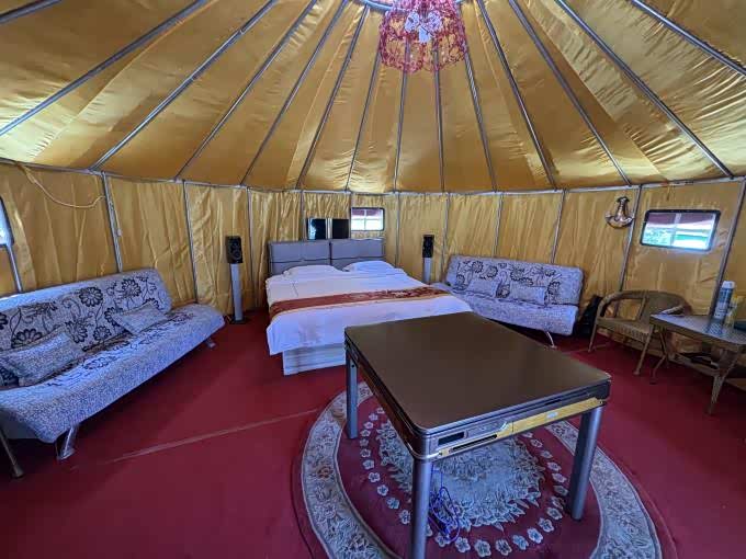 房间设施:共18间客房,能同时接待50人。不管是温馨的标间、舒适的大床房,还是宽敞的里外间套房和蒙古包都任你挑选!客房空间布局合理:每间房配备麻将机,都有独立卫浴,满足游客多种需求。精品大床房,内部装修豪华,设施高档。智能马桶,从装修装饰到家具用品都围绕主题设计,营造独特居住氛围。