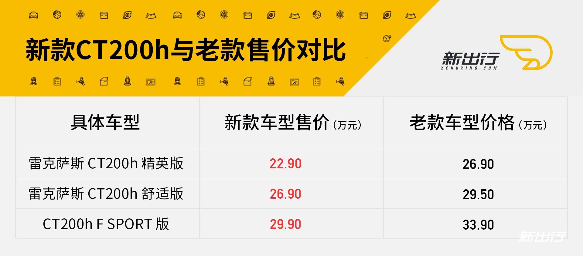 新款雷克萨斯 CT200h 推出了精英版、舒适版和 F SPORT 版这 3 款车型,官方指导售价分别为 22.90 万元、26.90 万元和 29.90 万元。此次升级的车型作为这一代 CT 系列的最后一次改款,主要针对外观和配置方面进行了提升。