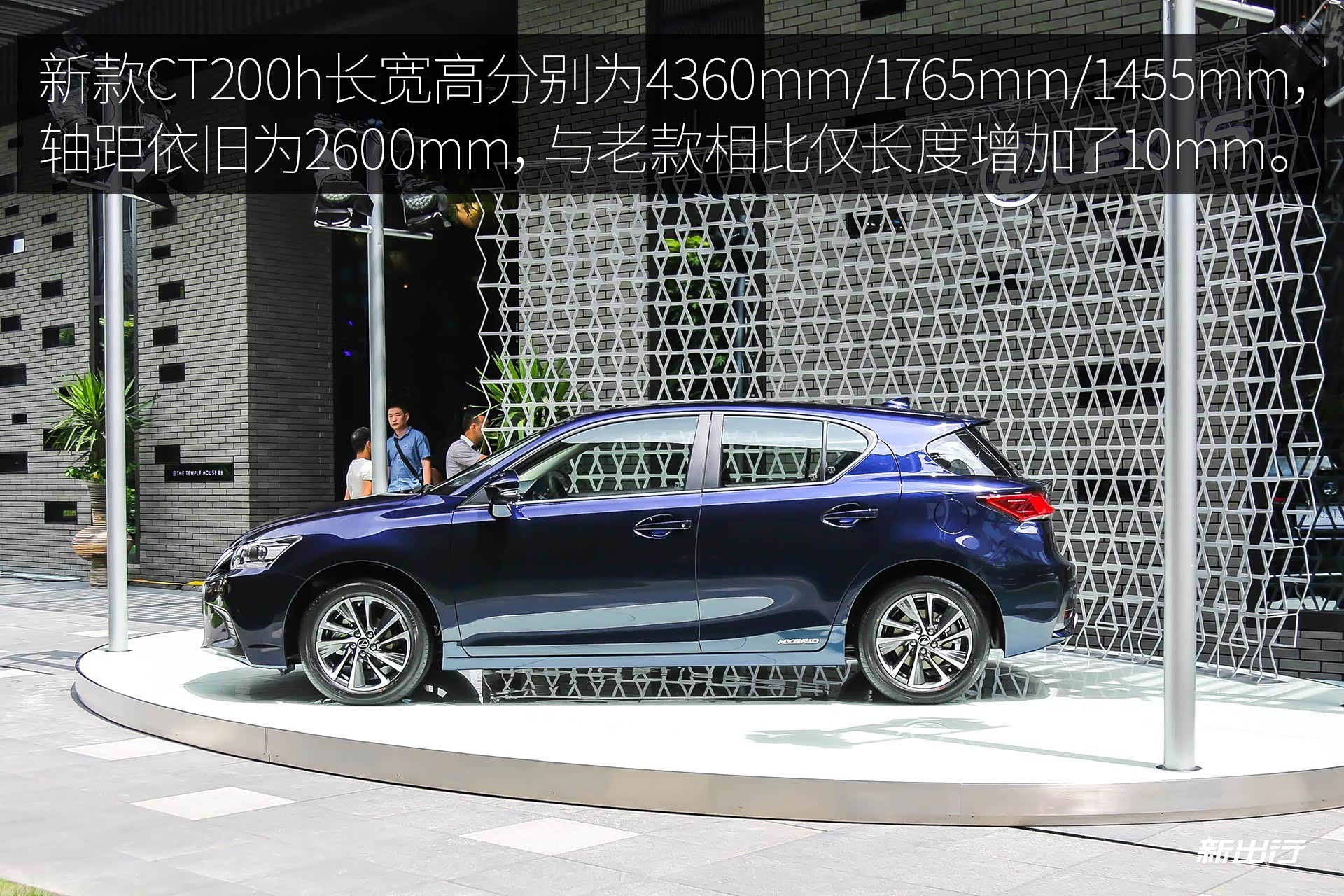 新款雷克萨斯 CT200h 车身的长宽高分别为 4360mm/1765mm/1455mm,轴距与老款同为 2600mm,其中仅车身长度相比老款略加长了 10mm。新车还换上了全新样式的双色铝合金轮毂,同时车身侧面裙边处上的“HYBRID”标识也进行了小改,使得立体效果更明显。