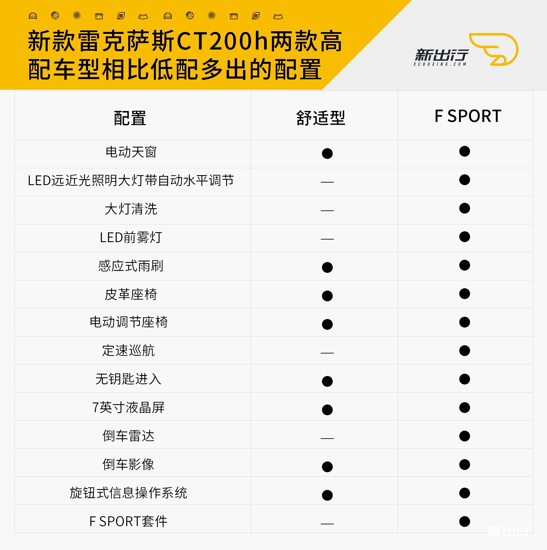 作为 CT 系列最后一次改款车型,同时也仅推出了 3 款车型,从配置和定价上来看,新出行更推荐购买中配的舒适版。当然你要是追求个性化和运动,多花 3 万元选择 F SPORT 版也可以。