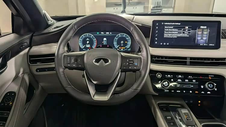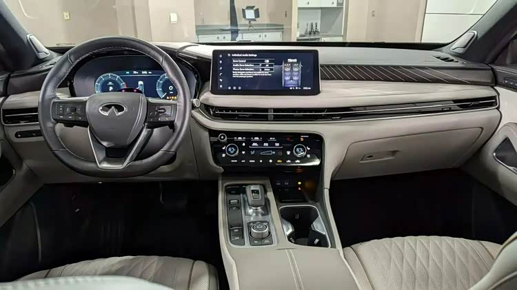 走进车内,全新QX60的内饰总体布局变化不大,但在细节上进行了优化和提升。悬浮式大屏的体积增大,与液晶仪表盘组成双屏系统,科技感十足。对于国产版本而言,大尺寸屏幕已能充分满足需求。富有层次感的中控台面采用特殊质感面板覆盖,既提升了内饰的档次感,又显得更加高级。撞色工艺的内饰配色为驾驶者营造了一个温暖舒适的驾乘环境,偏向驾驶者的布局设计充分考虑了操作的便捷性。平底构造的方向盘进一步提高了汽车的运动属性。扶手箱正面区域安装了电子挡杆、手机及杯架等部件,同时保留了大量弧线造型,延续了英菲尼迪一贯的设计风格。
