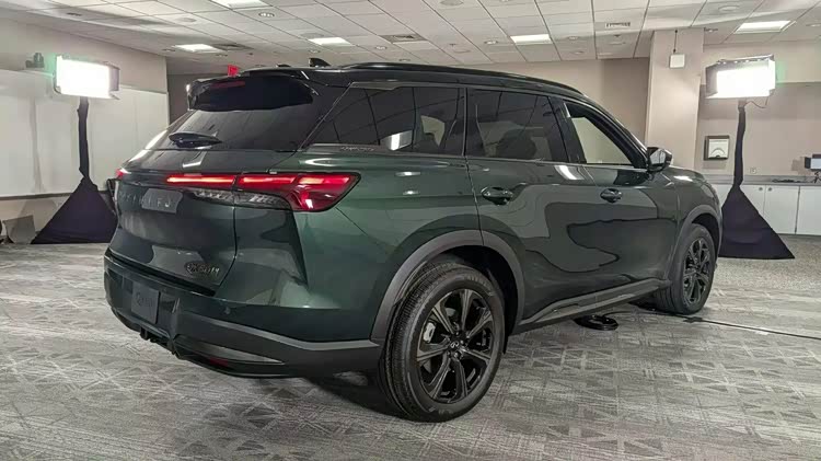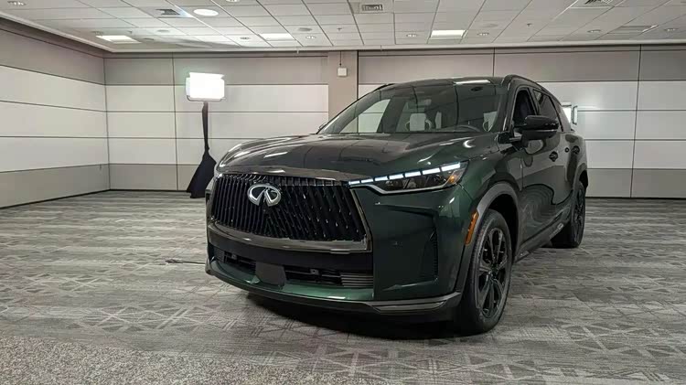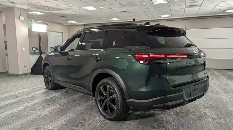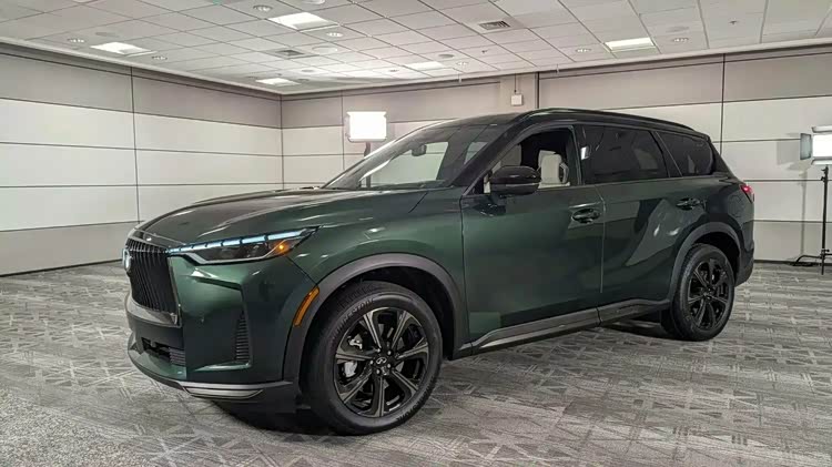 车身侧面,作为改款车型,全新QX60并未进行大幅调整,标志性的宽而纤细线条得以保留。撞色车身与悬浮式车顶的组合,营造出了时尚动感的视觉效果。大型轮毂的加入,不仅提高了汽车的通过性,还为整车增添了几分霸气。此次改款还专门引入了绿色车漆这一独特色彩,让全新QX60在众多车款中脱颖而出,尽显时尚个性。