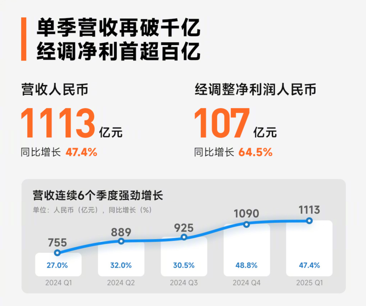 小米集团本季度总收入达到人民币 1113 亿元,同比增长 47.4%,创下历史新高;归属于母公司的净利润为人民币 109.24 亿元,较上年同期的 41.82 亿元大幅增长;经调整净利润为人民币 107 亿元,同比增长64.5%,同样刷新历史纪录,其中,智能手机业务收入为人民币 506 亿元,同比增长 8.9%;全球智能手机出货量达 4180 万台,同比增长3.0%。