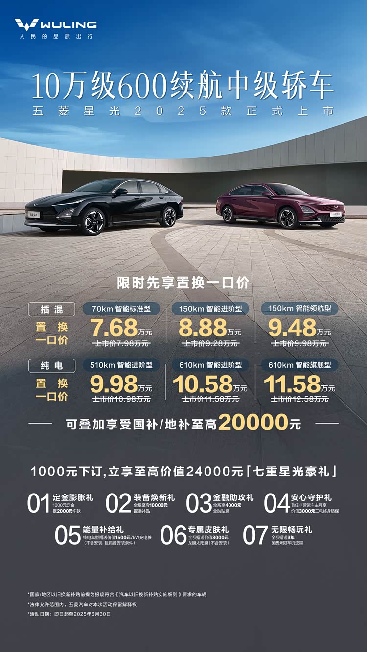 2025款五菱星光插混版车型共3个版本,分别为70km智能标准型、150km智能进阶型及150km智能领航型,置换一口价为7.68-9.48万元;而纯电版本车型此次将原有的电池组容量进行了升级,由原来41.9kWh、54.5kWh的电池组升级为54.5kWh、69.2kWh,CLTC工况下续航也提升至510km-610km。2025款五菱星光纯电版共三个配置——510km智能进阶型、610km智能进阶型和610kmkm智能旗舰型,置换一口价为9.98-11.58万元。此外,以上价格还可叠加国家报废补贴,最高可享受2万元相关补贴。
