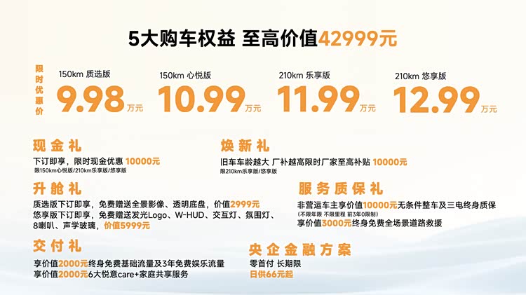 特别值得一提的是,购买新车还可享多项权益。包括现金礼:下订即享,限时现金优惠10000元;升舱礼:旗舰版下订享,免费赠送全景影像、透明底盘,价值2999元;尊崇版下订享,免费赠送发光Logo、W-HUD、交互灯、氛围灯、8喇叭、声学玻璃,价值5999元;服务质保礼:非营运车主享价值10000元无条件整车及三电终身质保,价值3000元终身免费全场景道路救援。此外还包括焕新礼、交付礼等。