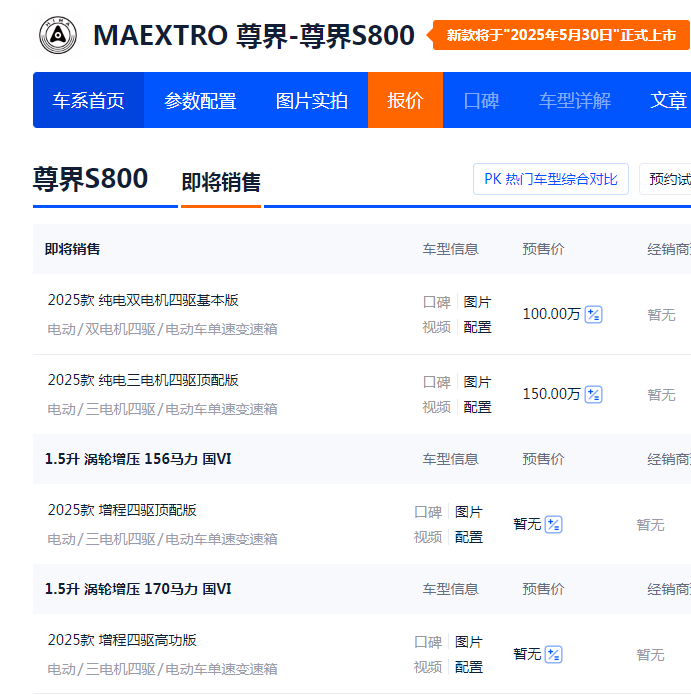 尊界 S800 提供增程式混动与纯电两种驱动形式。其中,纯电版分为两个功率版本,最大功率分别为 390 千瓦和 635 千瓦,CLTC 续航里程分别为702 公里和 622 公里。增程式版本则搭载由 1.5T 发动机与电动机组成的动力系统,其中两个功率版本的发动机最大功率分别为 115 千瓦和 125 千瓦,电动机总功率为 635 千瓦。