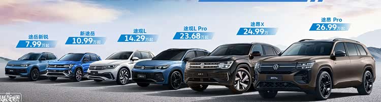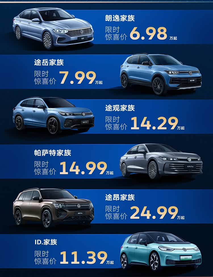 目前,上汽大众朗逸家族最低售价6.98万、途观家族最低售价14.29万、帕萨特家族最低售价14.99万、途昂家族最低售价24.99万、ID.家族最低售价11.39万元。