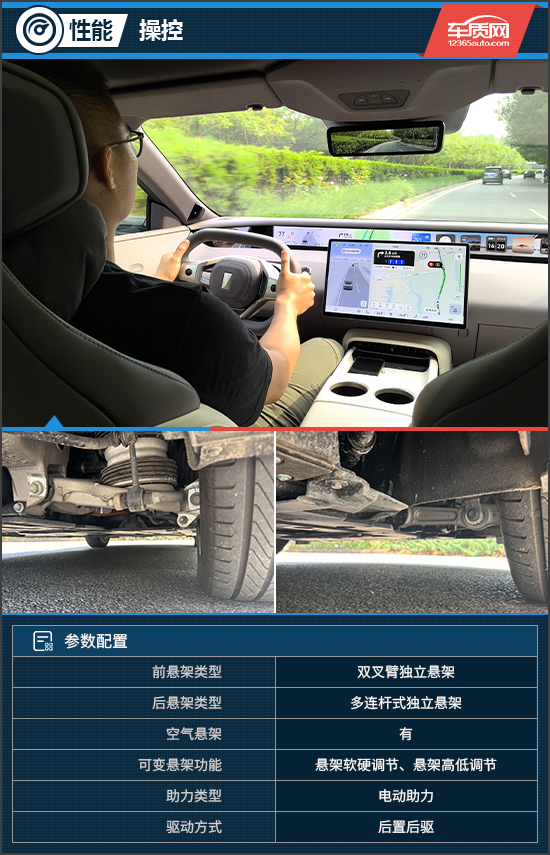 评测车搭载的主动预瞄式魔毯悬架由空气悬架与CDC动态阻尼减震器组成,可通过激光雷达和摄像头实时感知前方路况,主动调节阻尼值以提升舒适性。在舒适模式下,底盘具备一定韧性,对路面颠簸的过滤十分到位,配合柔软宽大的座椅,整体行驶质感颇具高级感。切换至运动模式后,悬架阻尼变化并不明显,但在高速过弯时可提供更强的支撑性,增强操控信心。需指出的是,在应对大幅度颠簸时,车身会出现少许多余震动。