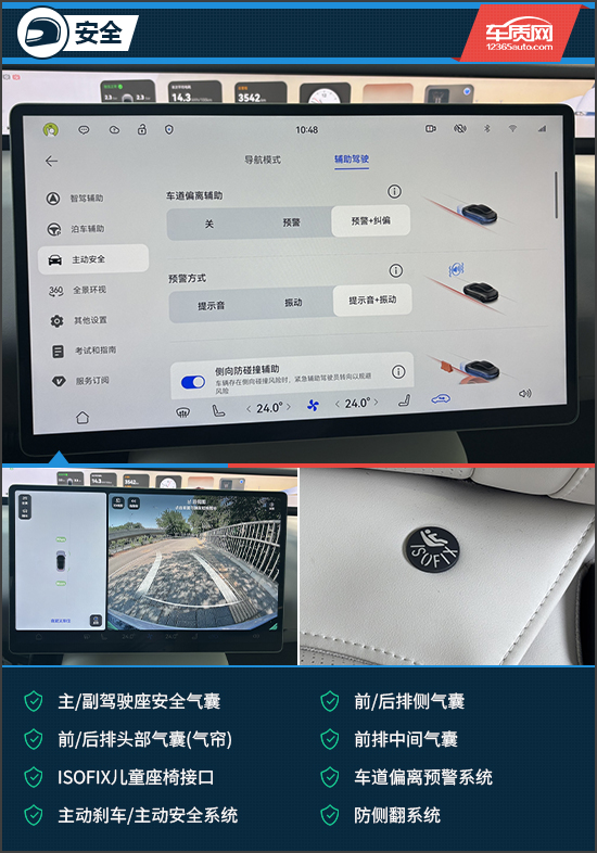 安全配置方面,评测车搭载了丰富的主/被动安全配置。诸如主/副驾驶座安全气囊、前/后排侧气囊、前/后排头部气囊(气帘)、前排中间气囊、车道偏离预警系统、防侧翻系统在评测车上均有配备,可以有效提升行车安全性。而在电池安全方面,评测车搭载宁德时代高安全电芯,结合航天级气凝胶隔热材料、四重泄压防护结构和高效液冷系统,确保极限环境下依然“零热蔓延”。