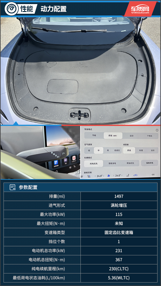 评测车搭载由1.5T发动机与后置单电机组成的增程式动力系统,发动机最大功率115kW,电机总功率231kW,总扭矩367N·m,匹配容量为31.7kWh的磷酸铁锂电池,CLTC纯电续航里程为230km,CLTC综合续航里程达到1190km。