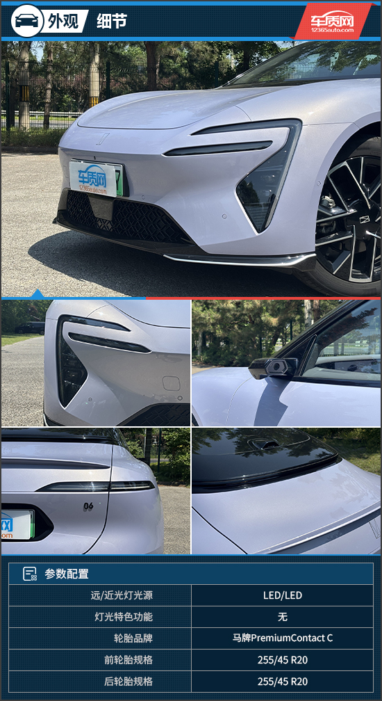 细节方面,评测车配备了丰富的选装件:运动套件为其带来了更为低矮的车身姿态;电子外后视镜则在降低风阻的同时,也有效提升了雨雪天气下的能见度;而电动开合车门则使得上下车更为优雅、便利。轮毂方面,采用20英寸气旋五辐运动轮毂,匹配马牌PremiumContact C系列轮胎,规格为255/45 R20,主打舒适、静音和节能,表现非常均衡。