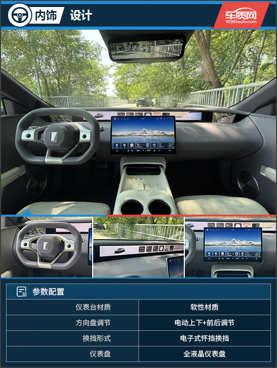 内饰方面,评测车采用极简风格的环抱式座舱布局,营造出浓厚的科技氛围与沉浸感。仪表台、门板、立柱等高频接触区域大面积覆盖高品质软质材料,全舱软包面积达7㎡,带来了出色的触感体验。与传统设计不同,该车未配备常规小尺寸全液晶仪表盘,而是在前风挡下方设置了一块35.4英寸的4K全景远端屏。该屏幕支持高度自定义,显示内容直观清晰,配合上异形方向盘,便于驾驶过程中快速读取信息,兼具实用性与未来感。此外,双6.7英寸高清后视屏被安置于全景远端屏两侧,支持三种焦段切换,可根据不同驾驶习惯提供更灵活的视野选择。不过,对于首次接触电子外后视镜的用户而言,需要一定时间去适应其显示逻辑与观察方式。