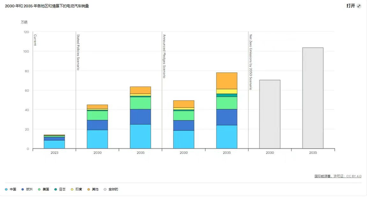 这种趋势并非中国独有,根据国际能源署发布的《2024全球电动汽车展望》(Global EV Outlook)报告,按既定政策(STEPS)模式下,也就是最保守估计:电动汽车的销售份额将从2023年的15%左右增长到2030年的近40%,到 2035年将超过50%。