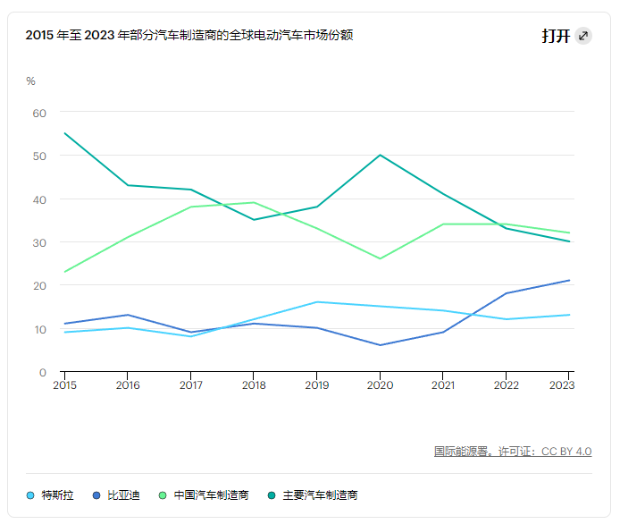 2023年,比亚迪和特斯拉仍遥遥领先,这两家公司合计占据所有电动汽车销量的35%。这一数字超过了中国以外所有主要汽车制造商的总和(略高于30%),也超过了所有其他中国汽车制造商(略低于30%)。(国际能源署《2024年全球电动汽车展望》)