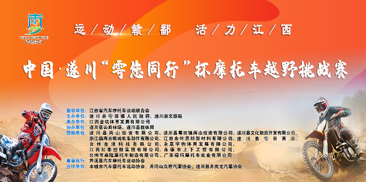 同时,衷心感谢江西红象控股集团、广东TR虎牌专业运动用品有限公司、美式马赛车机油、惠州市绿道运动器材有限公司、丰城越野汽车摩托车运动联合会、江西红象文化传媒、安徽省人众体育、广西超华体育传播有限公司、摩迪威机车、广州福玛机械有限公司、永康市上下工贸有限公司、红象(陕西)文化体育发展有限公司、阿波罗运动器械发展有限公司、广东硕为科技有限公司、浙江临海市鹿城机车部件有限公司、江西金叶恩熙新材料有限公司、台州金浪科技有限公司、广东慧鸿科技有限公司、浙江永康万宇工贸有限公司、遂川县井岗健茗茶叶店-淋洋健民茶厂、台州森隆摩托车制造有限公司等企业的慷慨赞助,诚挚感谢中国越野摩托极限运动解说员袁杰、广州老田越野解说带来的精彩解说;感谢井冈山众野汽摩协会、遂川县井岗龙汽摩协会、遂川县摄影家协会、萍乡市圆方创意传媒有限公司等社会团体的积极参与。正是社会各界的凝心聚力,才让这场赛事成为遂川体育文化和城市形象的闪耀名片。