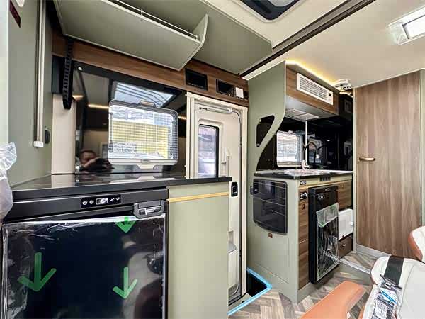 厨房区配置了带盖板的电磁炉(2100W)与不锈钢洗菜盆,下方嵌入90L双开门冰箱。特别设计的折叠式备菜板展开后增加0.6㎡操作台面,实测可同时放置砧板、电饭煲等6件厨具。储物系统包含18个暗格,总容积达580L,其中床底贯通式行李舱可容纳28寸行李箱+2个登山包。