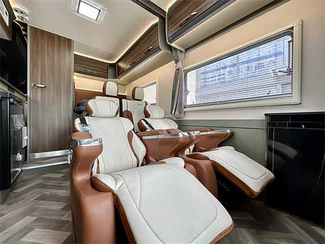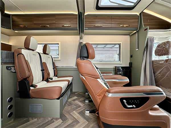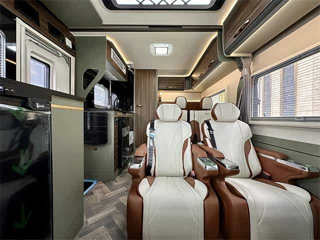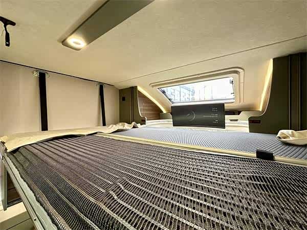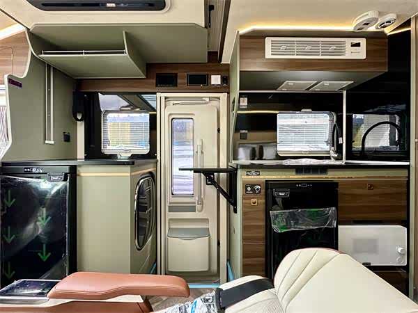 车内净高1.95米,采用"L型厨房+纵置子母床"的布局。会客区配备双人航空座椅,支持160°平躺模式,坐垫采用记忆海绵与高密度冷泡棉复合填充,连续乘坐4小时压力分布测试显示,臀部最大压强仅为28kPa,达到豪华轿车水准。餐桌采用电动升降设计,降下后可形成1.8×1.2米的临时床位。