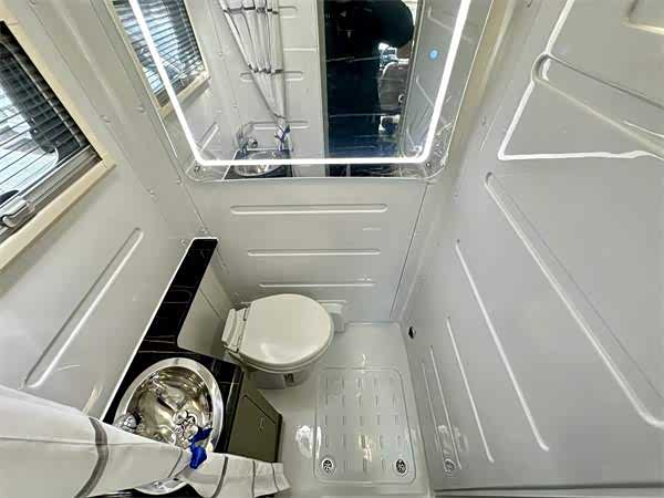 卫浴间采用整体式ABS模具成型,配备赛特福德旋转马桶与折叠洗手台。当洗手台收起时,淋浴区扩展至0.8㎡,身高1.85米的测试者也能舒适沐浴。污水箱配备电动排空系统,相比传统手动排放效率提升3倍。