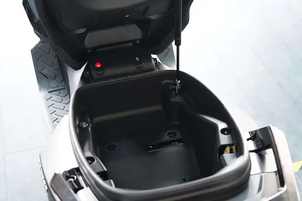 坐桶容积32L,由于电池部分设置在坐桶前方,侵占了一部分座桶空间,坐桶可容纳一顶全盔,以及随身的物品,两顶全盔是放不下的,不过可以放一顶全盔加一顶3/4盔。