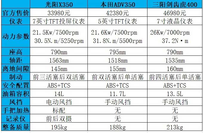 市场分析我们将33980元的光阳X350,42380元的本田ADV350,46980元的三阳剑齿虎400,进行一番对比,如下一图看清概要。