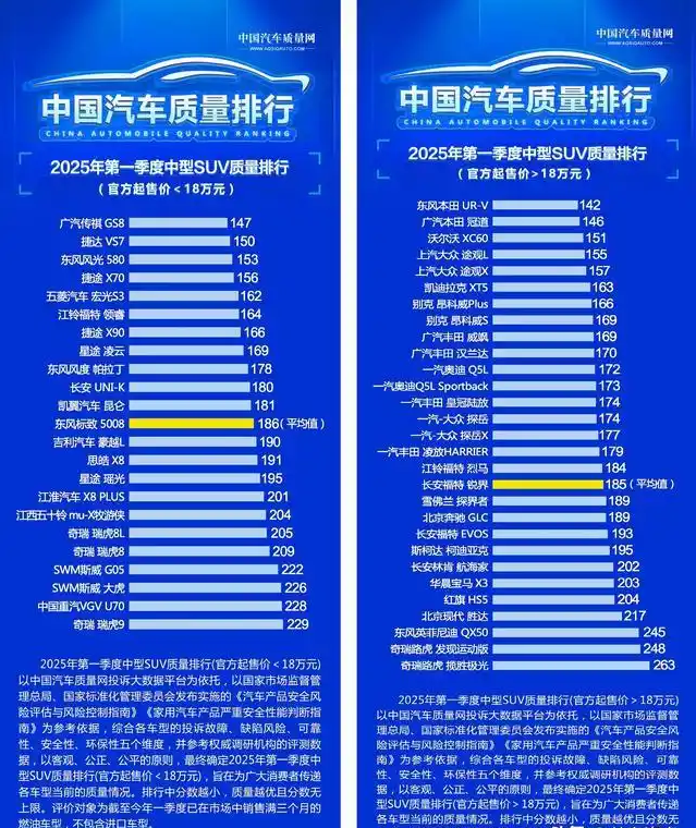 接下来是2025年中型燃油SUV质量排行,榜单也被分为两部分,其中起售价低于18万元的有捷途X70、福特领睿、长安UNI-K和捷达VS7等车型质量达标。而起售价高于18万元的中型SUV,知名车型沃尔沃XC60、途观L都是名列前五,凯迪拉克XT5、昂科威、丰田威飒和汉兰达也是入榜前十,奥迪Q5L、皇冠陆放和探岳等月销过万的车型,质量表现同样是处于行业平均值之上。