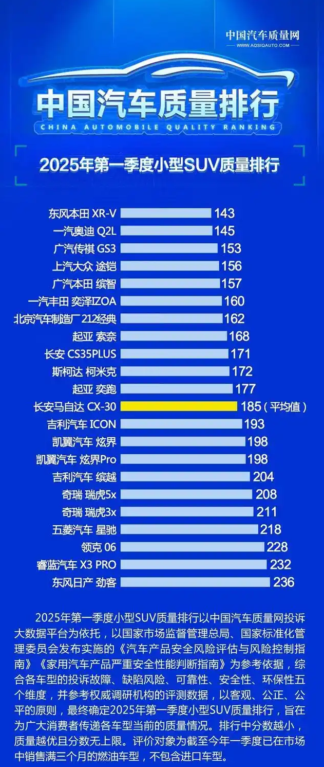 具体方面,首先来看下2025年小型燃油SUV质量最新排名,传统车型本田XR-V、传祺GS3、大众途铠和本田缤智全部是入榜前五名,且质量分数都未超过160分。丰田奕泽IZOA、起亚索奈、长安CS35 PLUS以及斯柯达柯米克同样是入榜前十,长安马自达CX-30则与行业平均值持平。