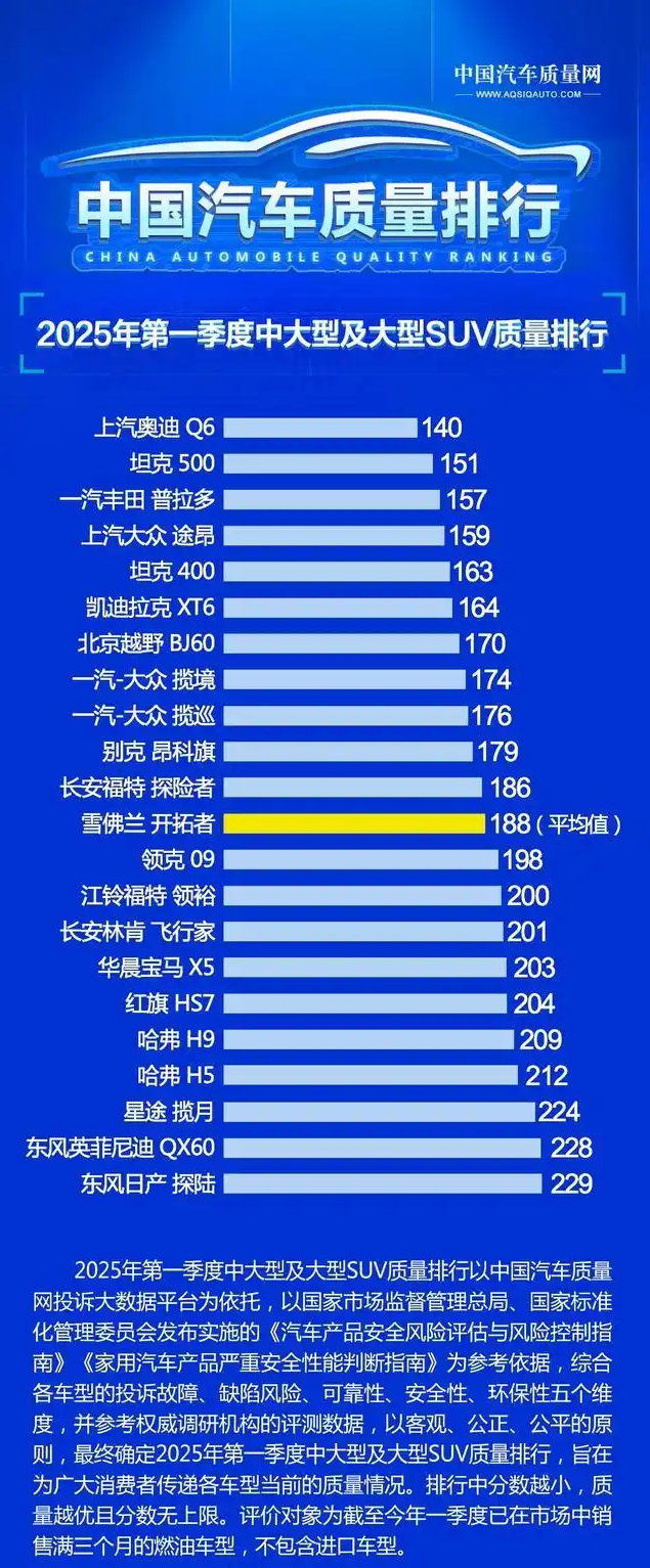 最后,2025年中大型及大型燃油SUV的质量榜,共有12款车型质量达标,其中有三款是国产车,坦克500高居第二,坦克400和北京越野BJ60也是入榜前八!其它车型方面,奥迪Q6、丰田普拉多、大众途昂等知名车型,质量表现都排名前五位,凯迪拉克XT6来到了第六位,揽境、揽巡、昂科旗和开拓者同样是表现不俗。