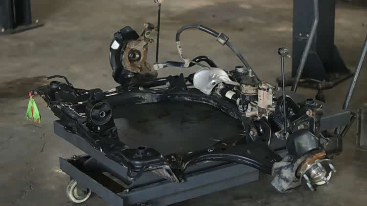 前悬挂元宝梁等待回装车身。