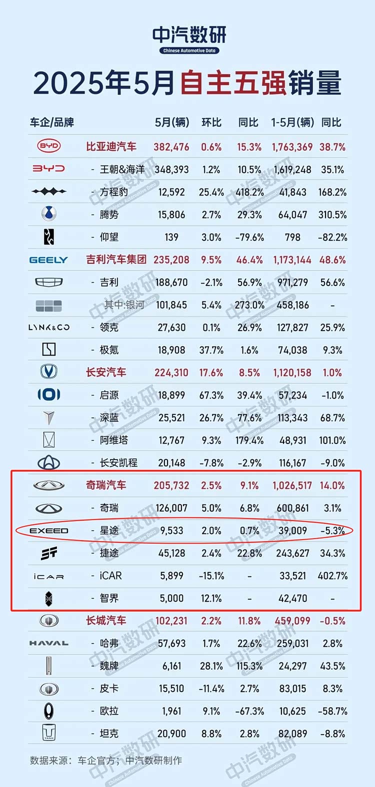 即便如此,在奇瑞集团前5个月的销量数据中,星途品牌也仍然是旗下汽车品牌中,唯一一个同比出现下降的品牌,1~5月累计销量3.9万辆。
