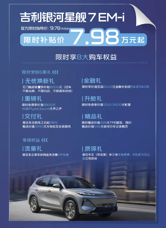 现在下单可享六重豪礼:无门槛置换补贴8000元(可叠加国家补贴至高2万元)、价值8800元的16扬Flyme Sound无界之声音响免费送。7.98万元起的限时特价,用合资车零头就能开走混动全能王。