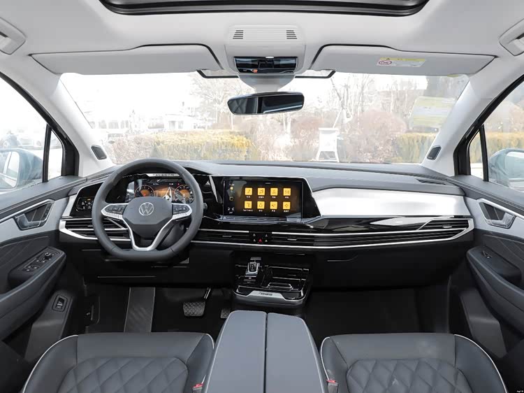 车辆内饰的设计让人眼前一亮,中控台层次分明,搭配贯穿式出风口展现出了大气的感觉,而且用料也很考究,摸上去柔软细腻,同时还配有亮面与拉丝饰板进行点缀,进一步提升了车辆质感。10.25英寸全液晶仪表盘与12英寸悬浮式中控屏采用了一体式设计,并且是全系标配,中控屏集成了语音控制、手机互联等多项功能,非常实用。三辐式的多功能方向盘配有银色元素进行点缀,R-Line版车型的方向盘上还配有“R”标识,此外,拨杆式的电子换挡机构也增强了车内的科技感。