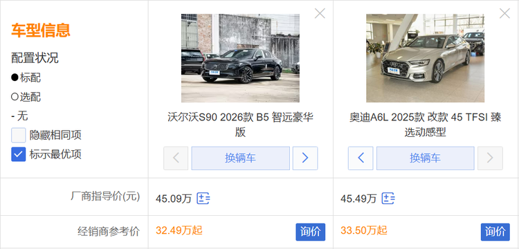 为了回答这个问题,我们选取了它们各自关注度最高的两款车型来做对比,分别是沃尔沃S90 2026款B5智远豪华版(下文简称:沃尔沃全新S90),以及奥迪A6L 2025款 改款 45 TFSI 臻选动感型(下文简称:奥迪A6L)。谁才是最优解,看完就清楚了。