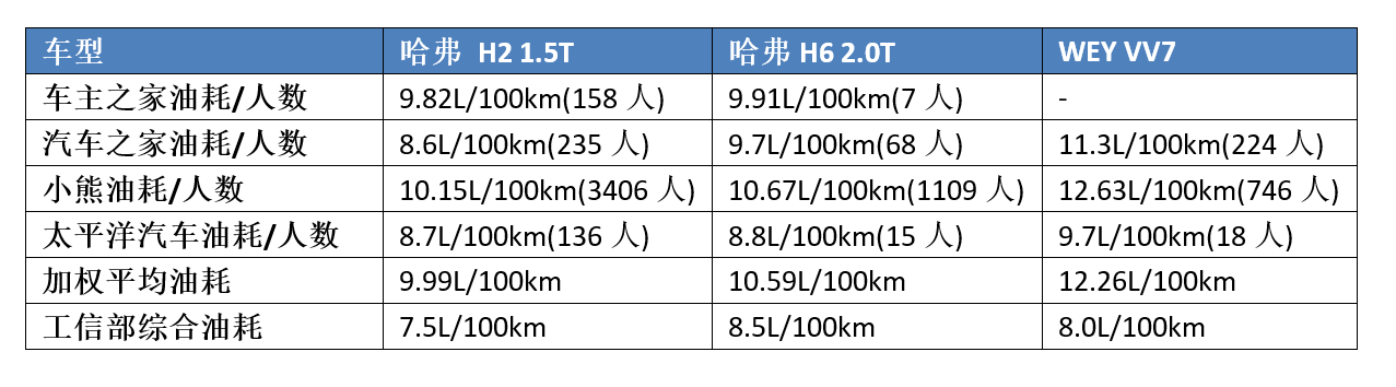 疆哥也根据四家的油耗数据和样本数据,计算了各车型的加权平均油耗,哈弗H2 1.5T为9.99L/100km,哈弗H6 2.0T为10.59L/100km,WEY VV7为12.26L/100km。在得出长城自身的一个油耗后,疆哥以小熊油耗为标准,与同级主流竞争对手的油耗(同样使用小熊油耗)进行一个对比,看看长城汽车的油耗放在外部去竞争是怎么样的一个情况。