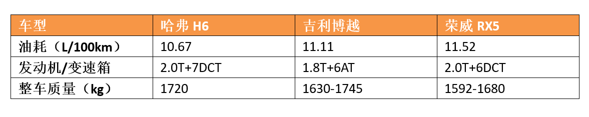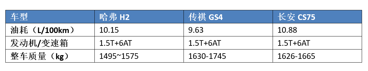 从上面的结果看出,小型SUV哈弗H2拥有最轻巧的车身,但是相比GS4和CS75这两款紧凑型SUV而言,油耗并没有任何优势,甚至比GS4高出了0.5L/100km,从数据上来看,哈弗H2反映出的是长城油耗并不低。