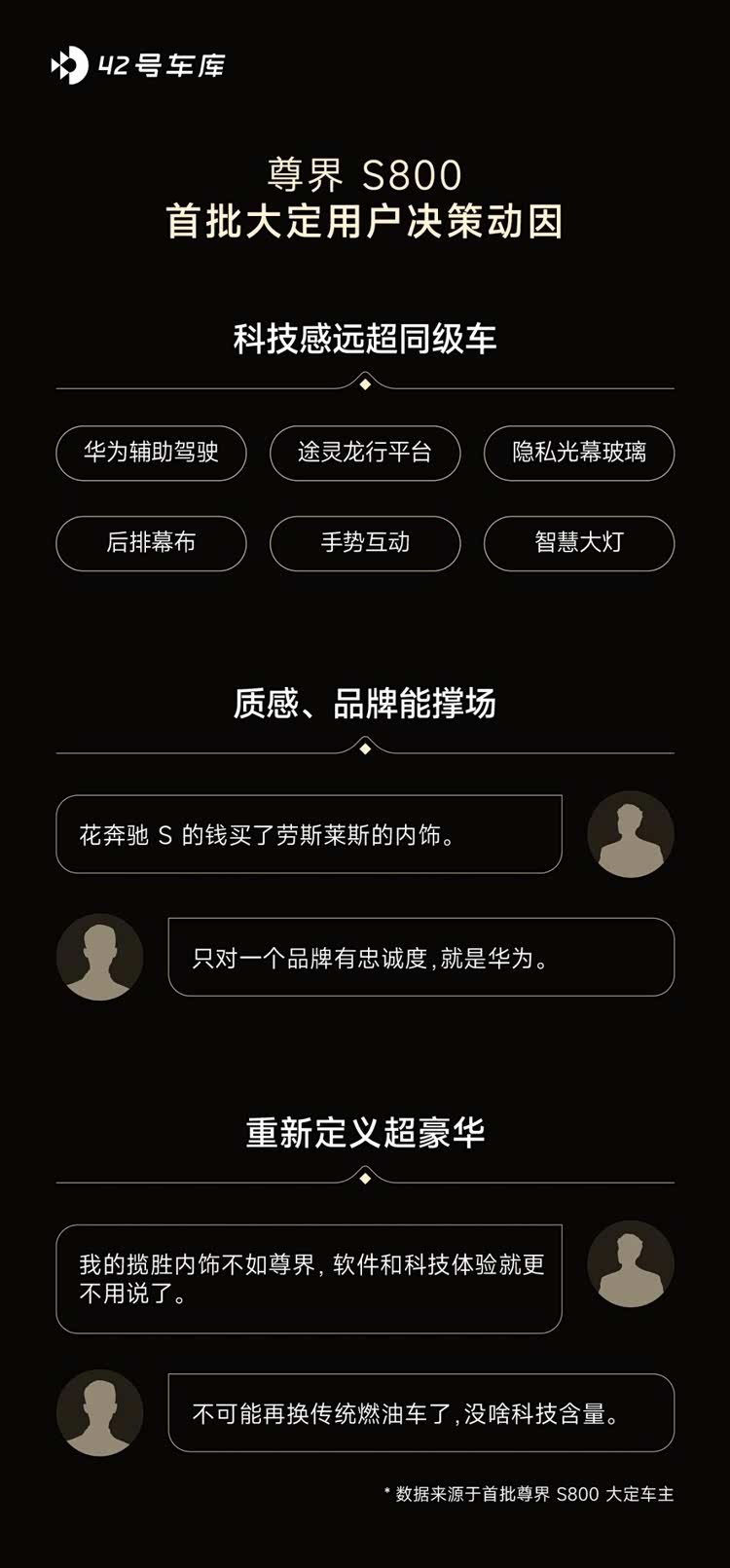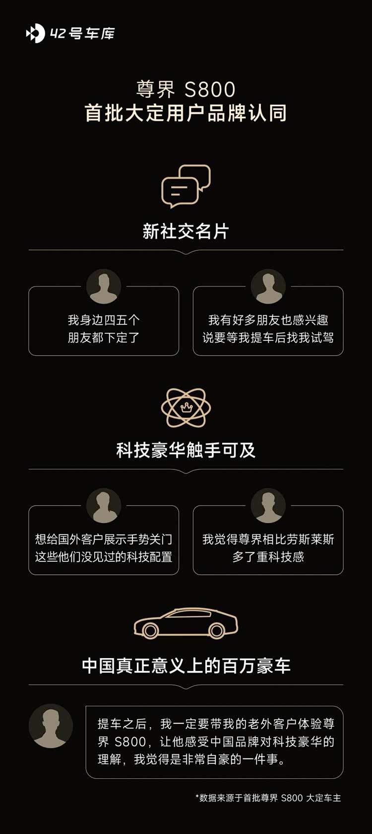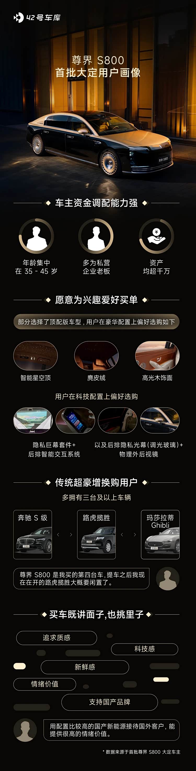 尊界S800的吸引力在于其科技加持的智能体验和远超同级的质感。它不仅仅是一辆车,更是一种全新的身份象征,它代表了实力与社交的完美结合。尊界S800的用户群体主要是私营企业主,他们构成了尊界的核心客群。这些用户不再仅仅追求品牌的光环效应,而是更加注重车辆带来的实际体验价值。