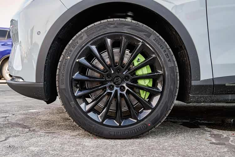 车轮方面,低配车型采用的为18英寸轮胎,中高配则升级成了20英寸,本文配图的为顶配版本,还给提供了多辐式熏黑轮毂以及绿色刹车卡钳,看上去有一股性能范儿,毕竟顶配的四驱版官方百公里加速时间为3.94秒,确实需要一套更好的刹车系统;另外,零跑C11的前后4个车门都采用了无边框设计,颜值挺高的,中高配车型还配备了前排双层夹胶玻璃用以降低噪音。