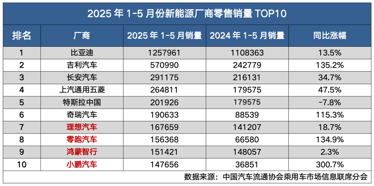 要我说,原因很简单,大家害怕造车新势力车企“暴雷倒闭”、“停摆跑路”,万一你买到个“烂尾车”,那可真的是砸在自己手里了,所以,我一直建议大家:买新能源车要谨慎,要尽量去选择那些主流品牌中销量好的车型,如果你不会选,教你个“笨办法”——看销量,下面是乘联会公布的2025年1-5月份新能源厂商销量榜单,理想、零跑、鸿蒙智行、小鹏都是销量靠前的新势力车企,甚至有些已经实现了正向盈利,相对来说,它们暴雷跑路的概率很低。